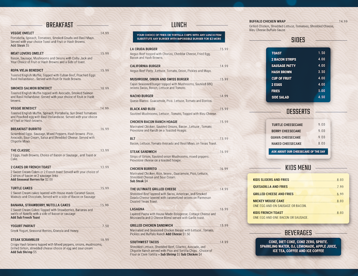 Toasted English Muffin, Topped with Cuban Beef, Poached Eggs Basil Hollandaise.. Served with Fruit Or Hash Browns